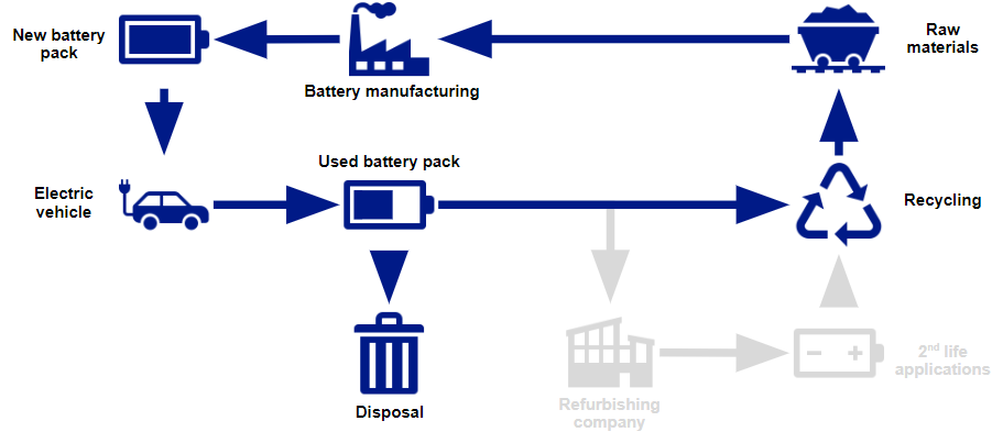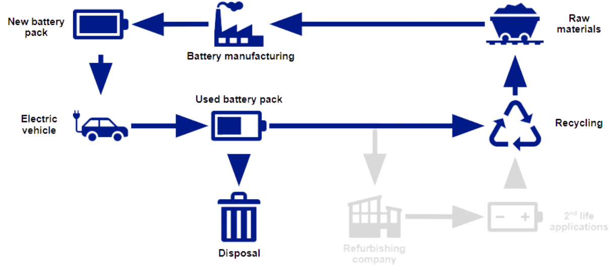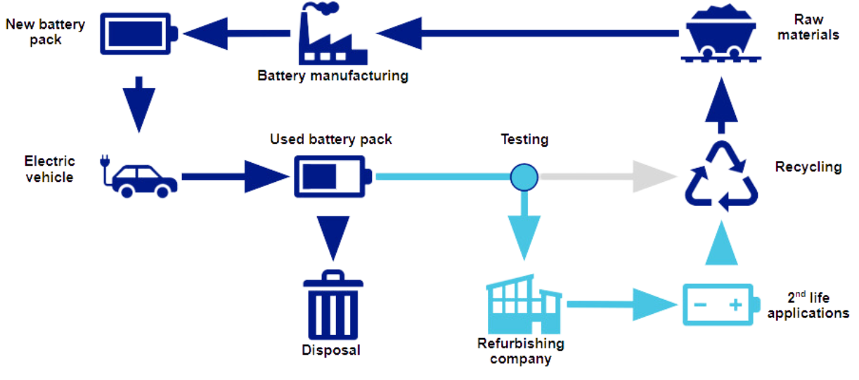 The typical EV battery lifecycle involves several stages. It begins with the collection of raw materials for manufacturing the battery, followed by the creation and installation of the battery pack in the vehicle. Over time, as the vehicle undergoes multiple driving cycles, the battery becomes less efficient and eventually reaches the end of its usable life. At this point, the battery needs to be partially disposed of and recycled to recover some of the valuable raw materials. However, this process falls short in terms of fully harnessing the battery's potential.