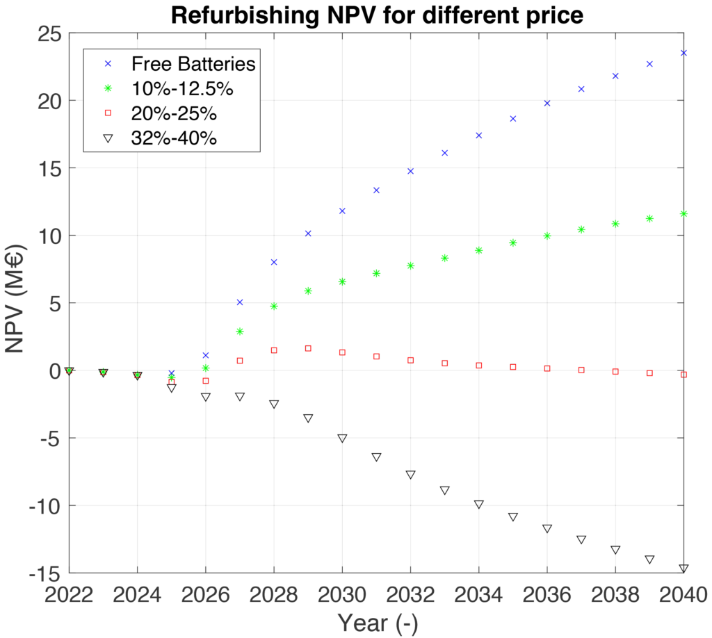 2.  The cost model identifies which are the main factor that impact the final cost of a SLB product and starting from the most significant it was possible to evaluate the NPV for both repurposing and refurbishing cases: